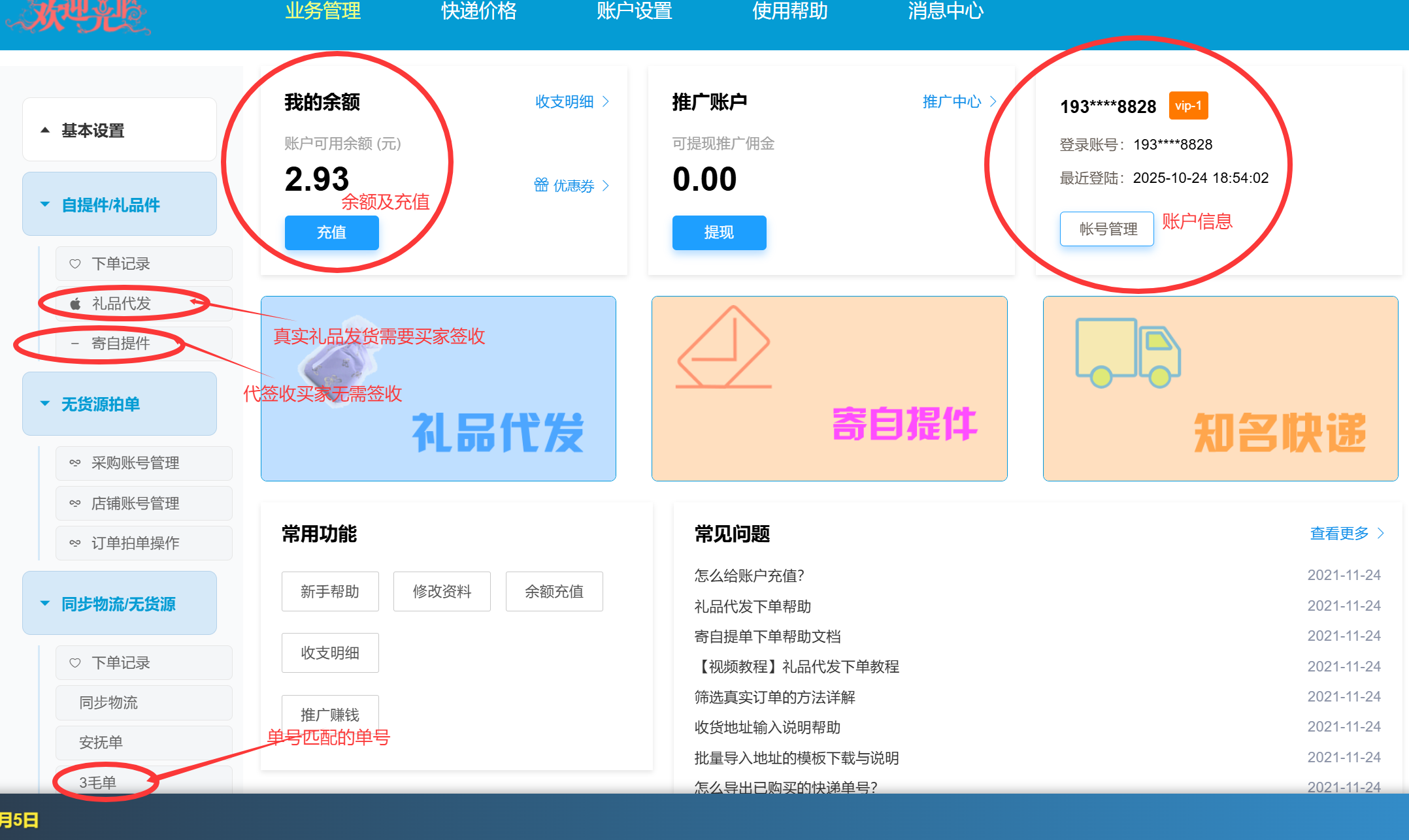 3,注册后登陆进去,可以查看账号信息,左边图列有礼品代发(发实物)和寄件自提(代签收)还有其他类目3毛单(二次使用过的单号)以及流量平台【图三】