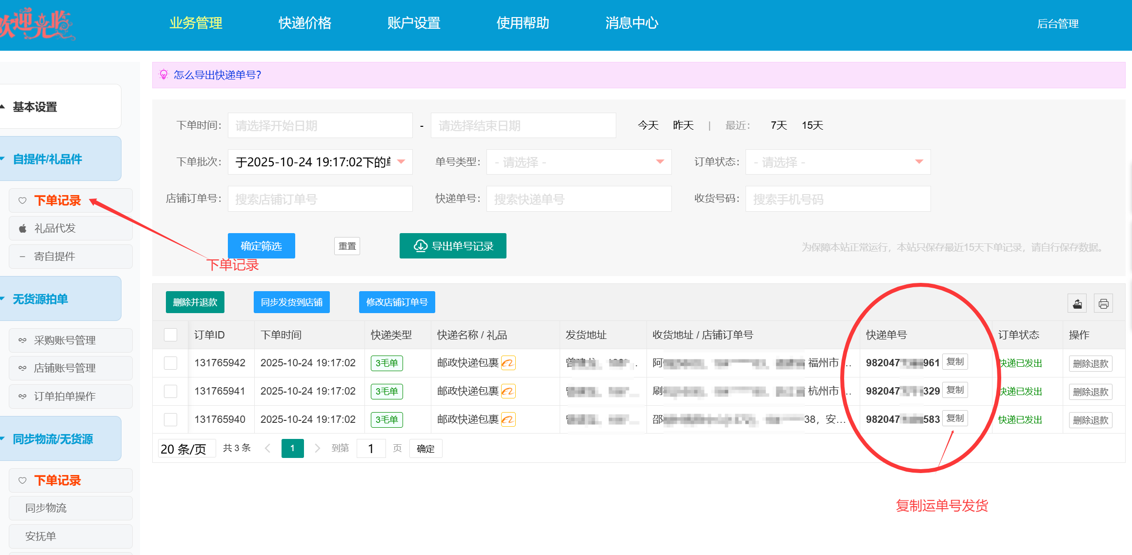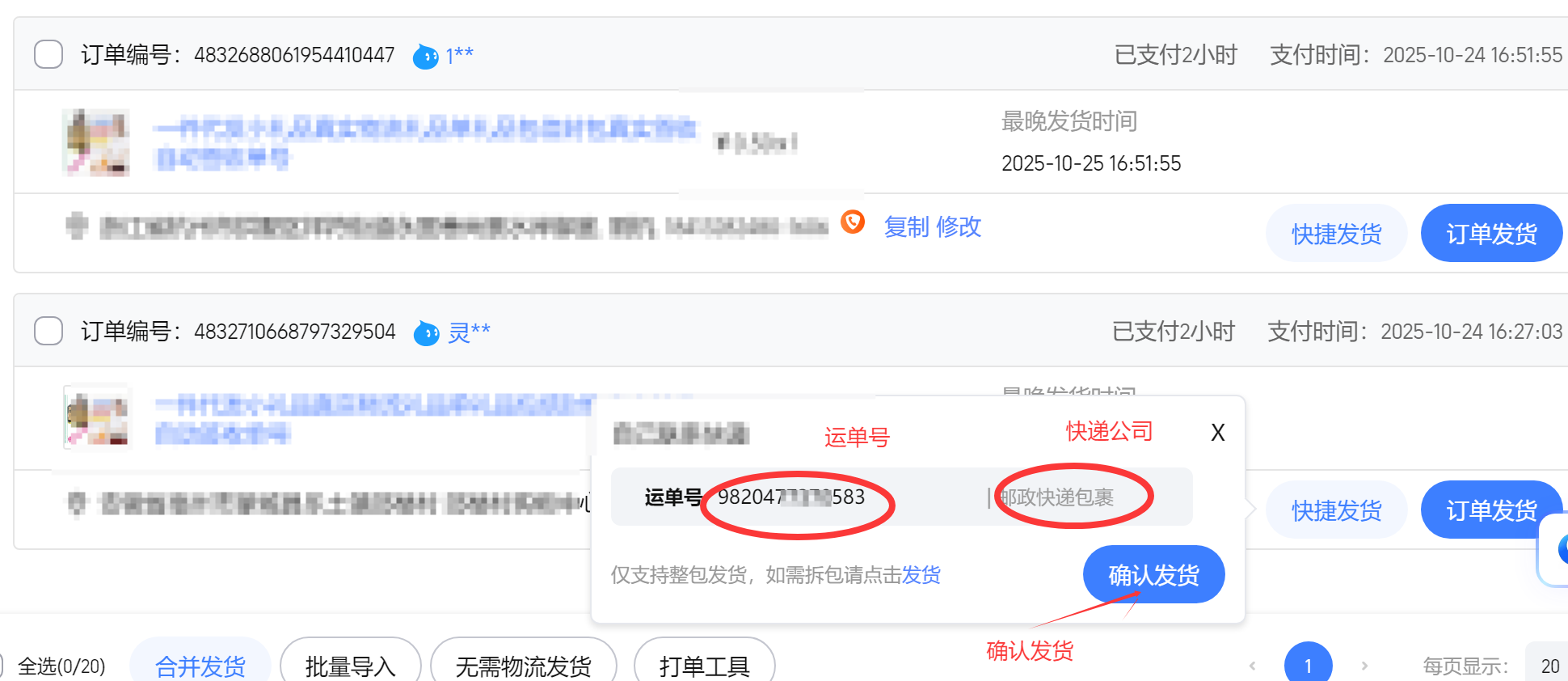 以上为手动复制发货,手机端和电脑端一样操作,若订单较多可以批量导入发货信息一键发货,也可以绑定店铺更加便捷