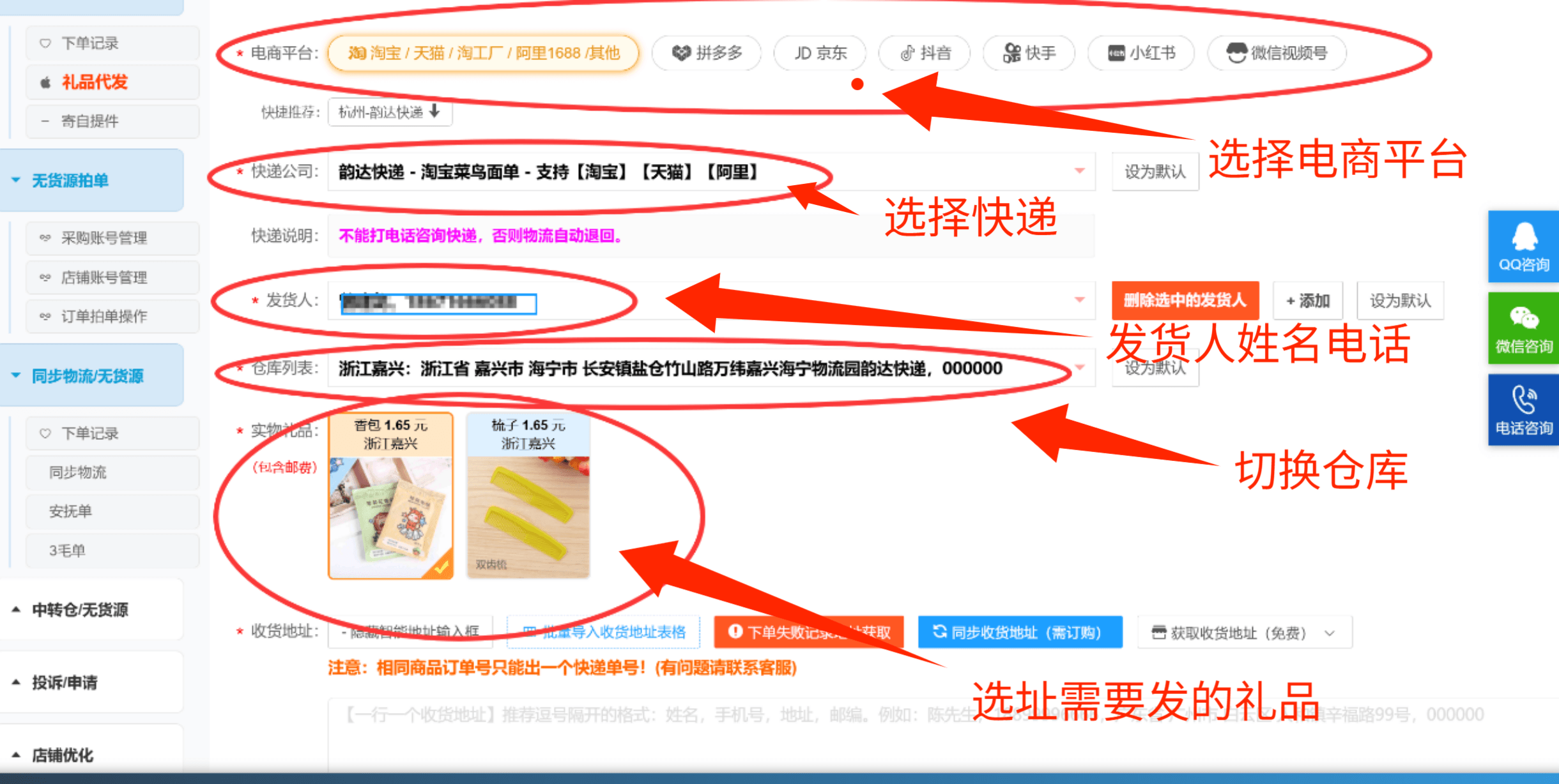 4,选择电商平台,这里所有电商平台均支持下单发货,选择快递公司,多个快递可选,然后设置发货人信息,填写自己信息即可,在选择仓库,多个仓库发货保证时效可快速回款,选择礼品,礼品多多可打开看,每个仓库礼品不一样【图四】