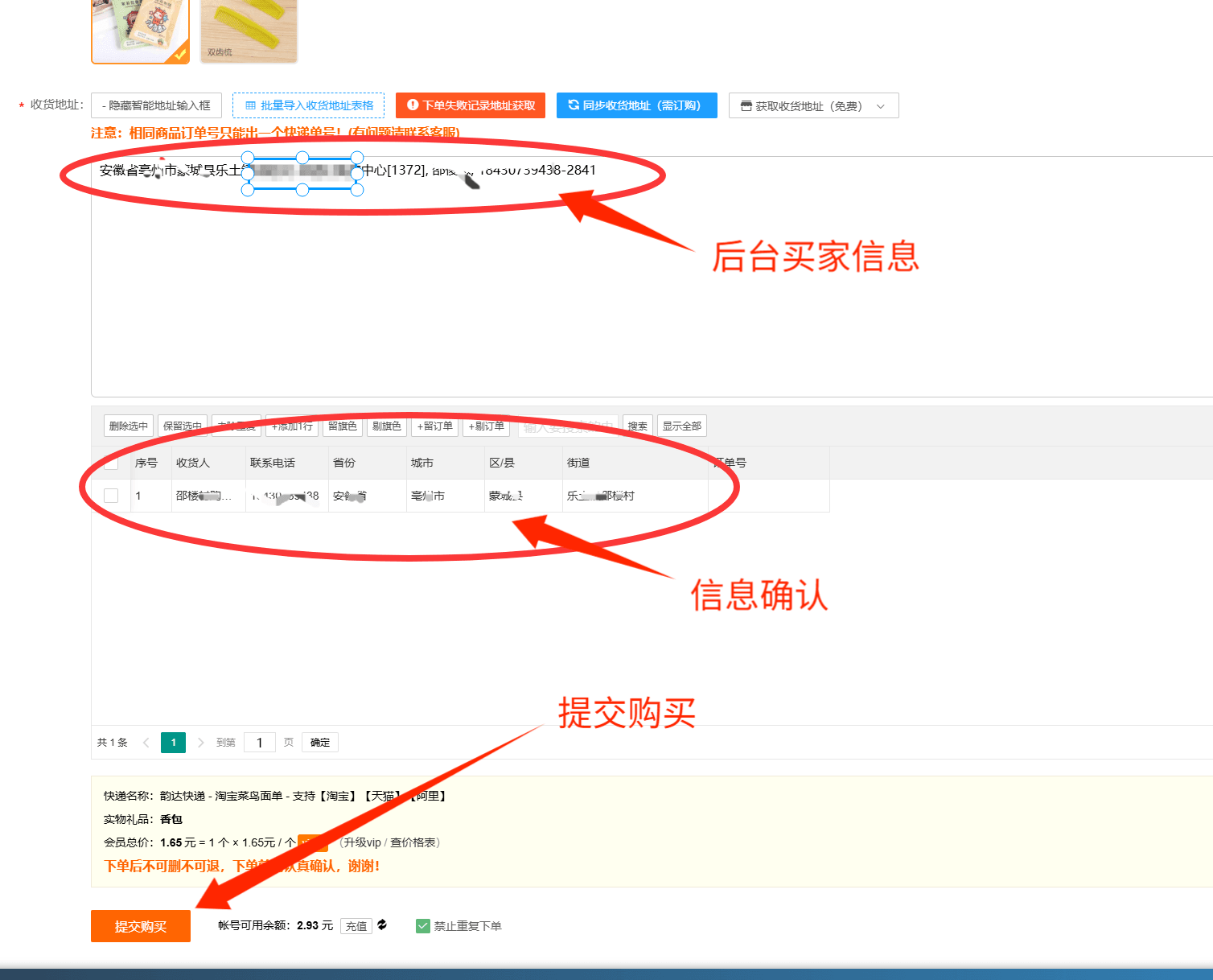 6,复制买家地址信息后在平台地址栏中确认无误后点击立即购买即可秒出运单号【图六】