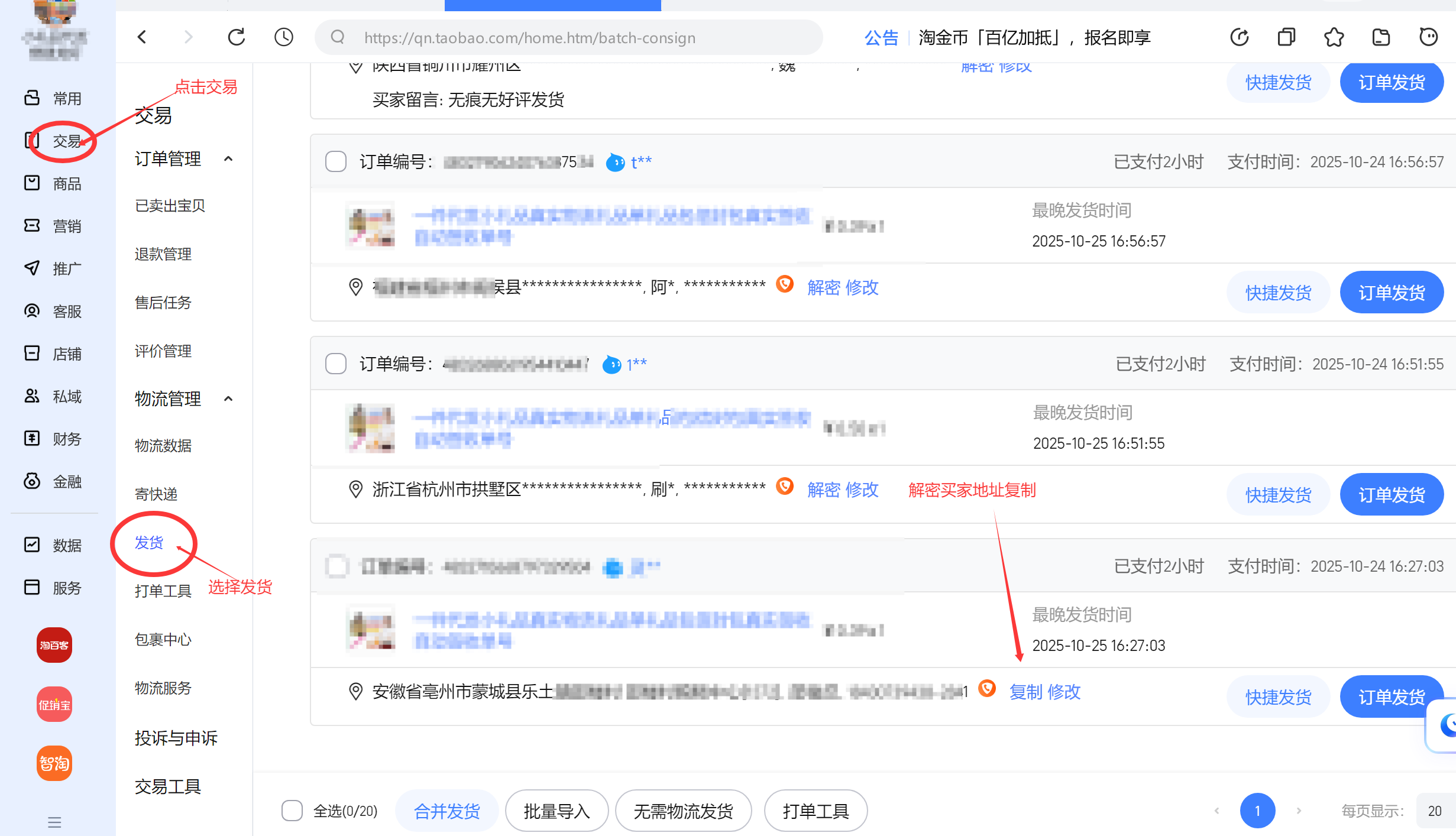 5,在商家后台可查看买家收货信息,复制买家地址【图五】